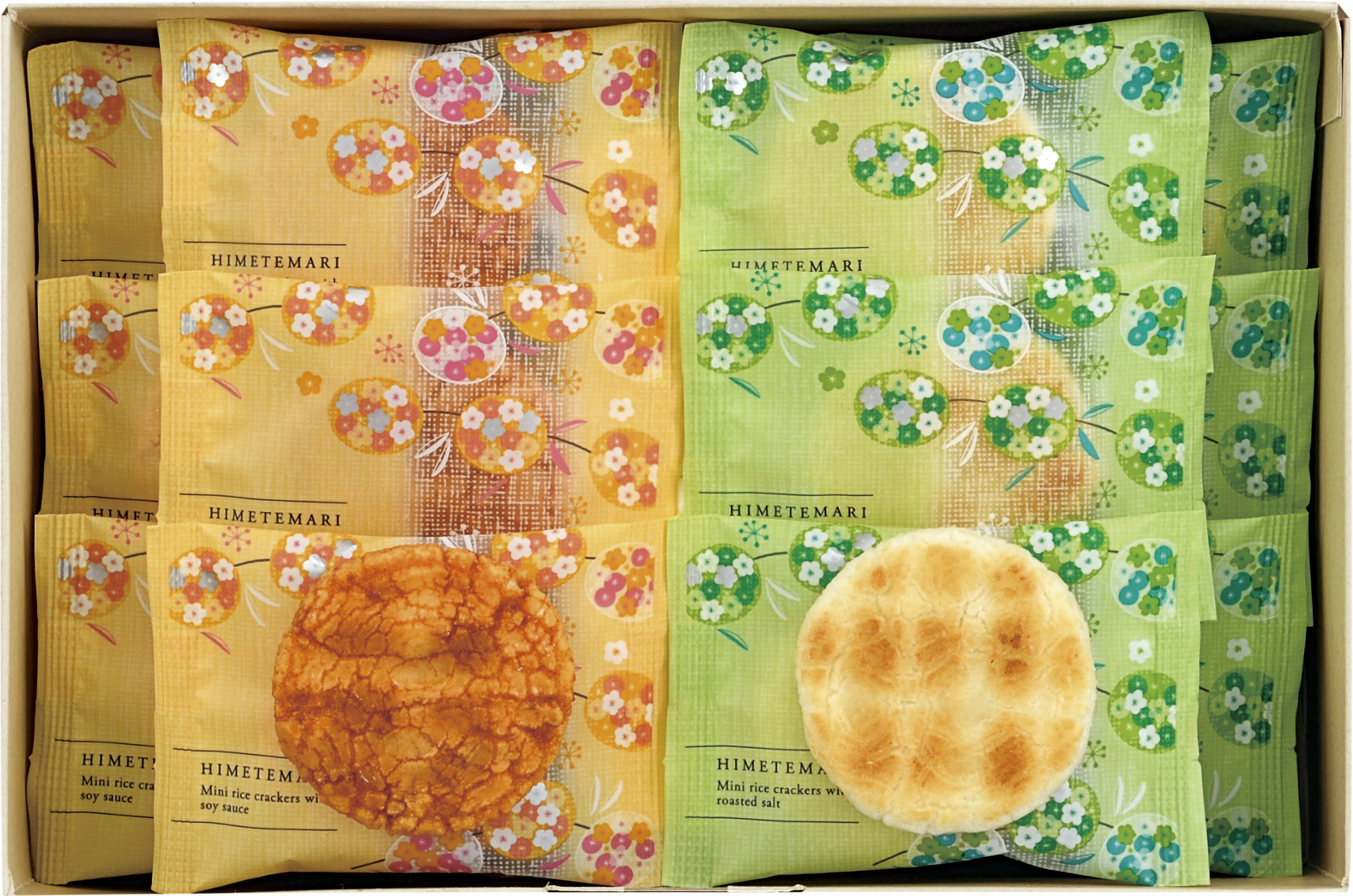 国内産うるち米100%使用の大判丸型の生地をじっくりと焼き上げ七味・サラダ・白ごま・みりん・たまり醤油・梅ざら・黒ごま・醤油・みその9種類の味に仕上げました。お米の旨味が9種類それぞれの味とうまく結びつき、個性ある味わいを生み出しています。