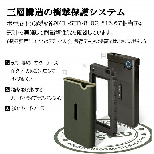 ・耐衝撃シリコンアウターケース仕様です。・先進の内蔵HDDサスペンションシステムを搭載しています。・ワンタッチ自動バックアップボタンを備えており、大容量ファイルのコピーなども即時に行えます。・ドライバ不要のプラグ&プレイに対応しています。・電源供給はUSBより行われるので外部アダプタ不要です。・省電力を考えたスリープモード搭載です。・Transcend Eliteソフトウェアが利用可能です。(Windows 7...