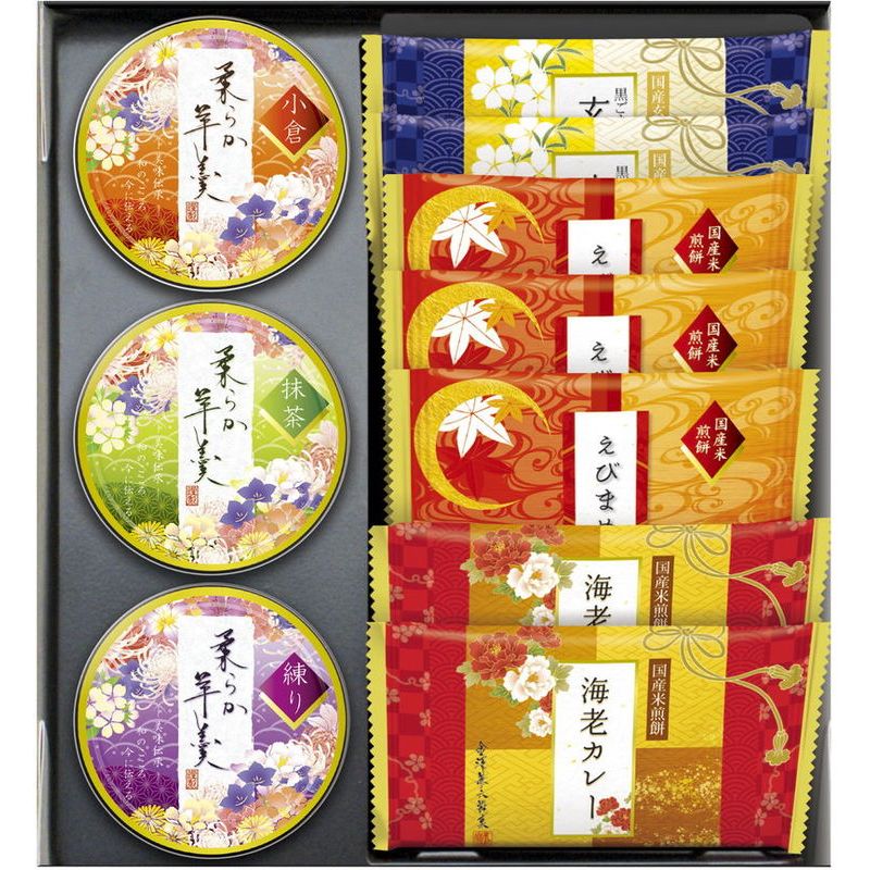 原材料 | あまからせん うるち米(国産)、植物油脂、グラニュー糖、米粉(国産)、ぶどう糖、粉末しょうゆ、食塩/調味料(アミノ酸等)、カラメル色素、(一部に小麦・大豆を含む) 黒豆醤油せん うるち米(国産)、黒大豆(遺伝子組換えでない)、植物油脂、しょうゆ、砂糖、白しょうゆ加工品、還元水飴、かつおだし、でん粉、酵母パウダー/増粘剤(加工デンプン)、カラメル色素、(一部に小麦・大豆を含む) 黒豆せんべい うるち米(国産)、黒大豆(遺伝子組換えでない)、植物油脂、食塩/調味料(アミノ酸等) 、(一部に大豆を含む) 豆おかき 水稲もち米(国産)、大豆(遺伝子組換えでない)、植物油脂、でん粉、食塩/調味料(アミノ酸等)、(一部に大豆を含む) |