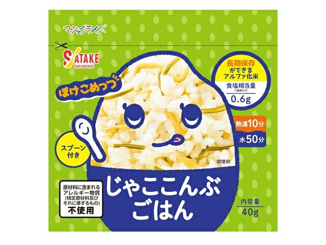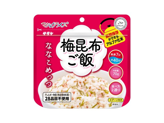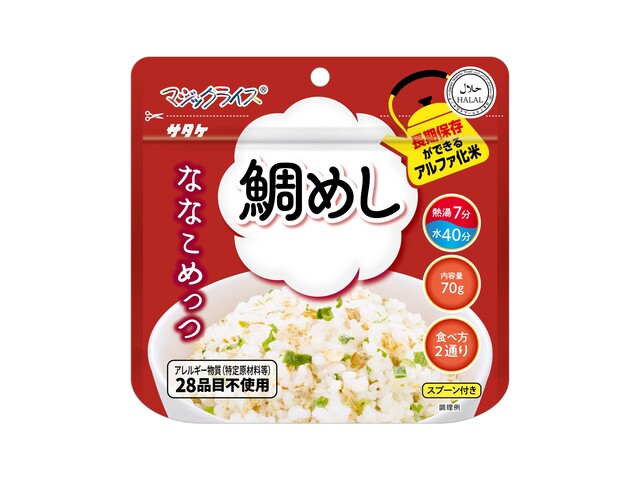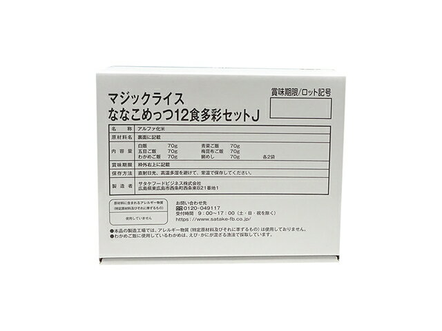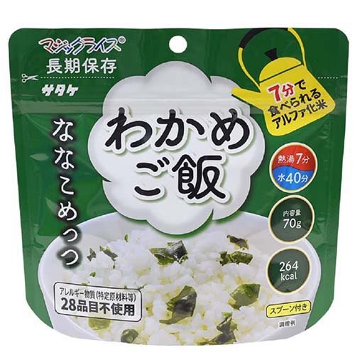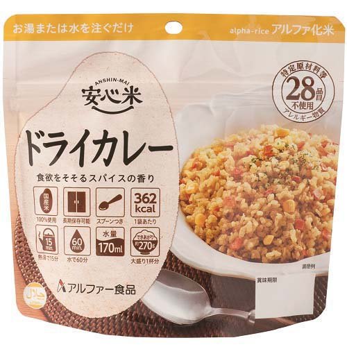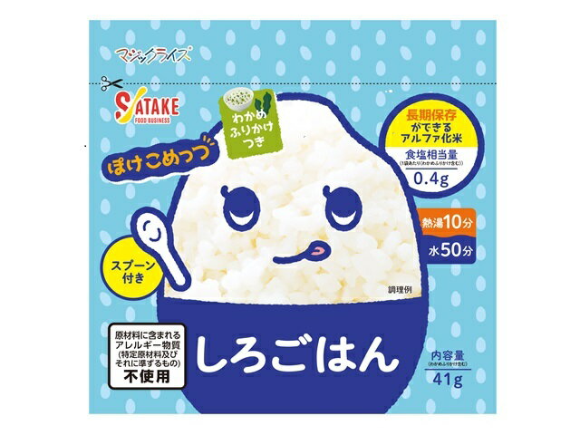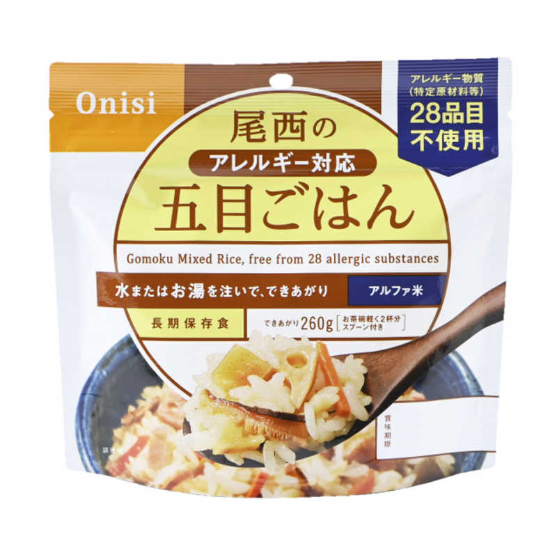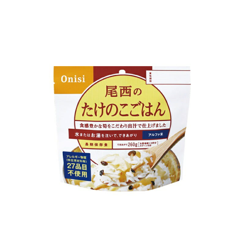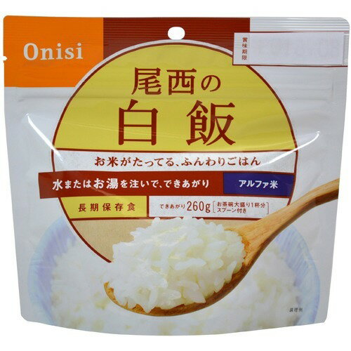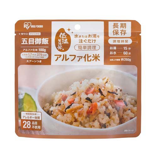 アルファ化米<BR>アレルギー物質、特定原材料7品目及び特定原材料に準ずる21品目不使用。<BR>熱湯や水を注いで、かき混ぜて待つだけの簡単調理。<BR>5年間の長期保存