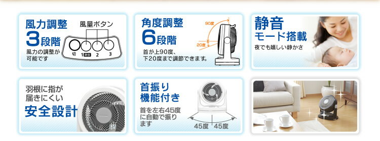 風量調節3段階左右首振り機能:角度=90度、後部つまみ式リズム風機能付きお子様の指が入らないメッシュガード採用左右首振り機能に加えて、手動で上下方向に角度調節が可能です。